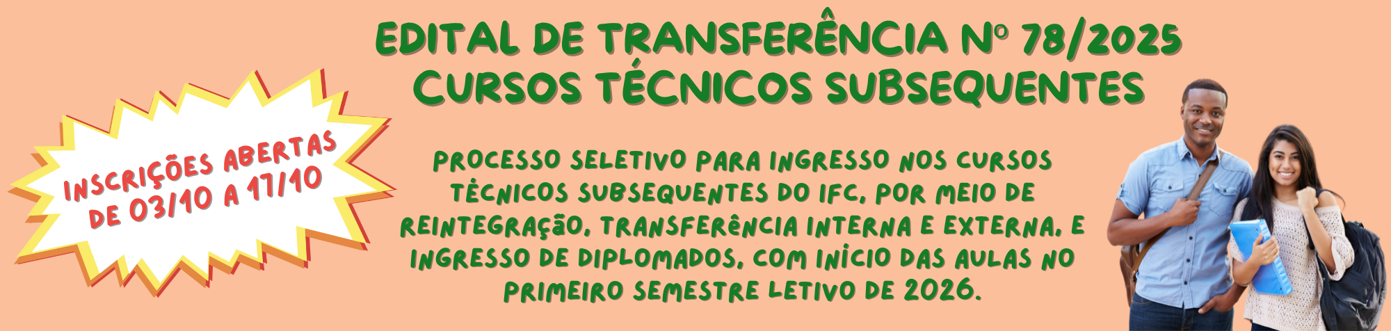 Confira o Edital para solicitação de Transferência Interna e Externa, Reintegração e Ingresso de Diplomados para os Cursos Técnicos Subsequentes, com início no primeiro semestre de 2026.