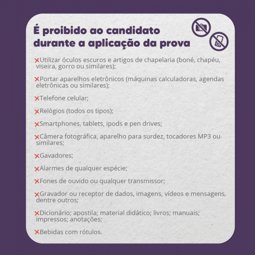 - A entrada dos candidatos será permitida até as 13h45min. Após esse horário, nenhum(a) candidato(a) poderá adentrar ao local de prova;