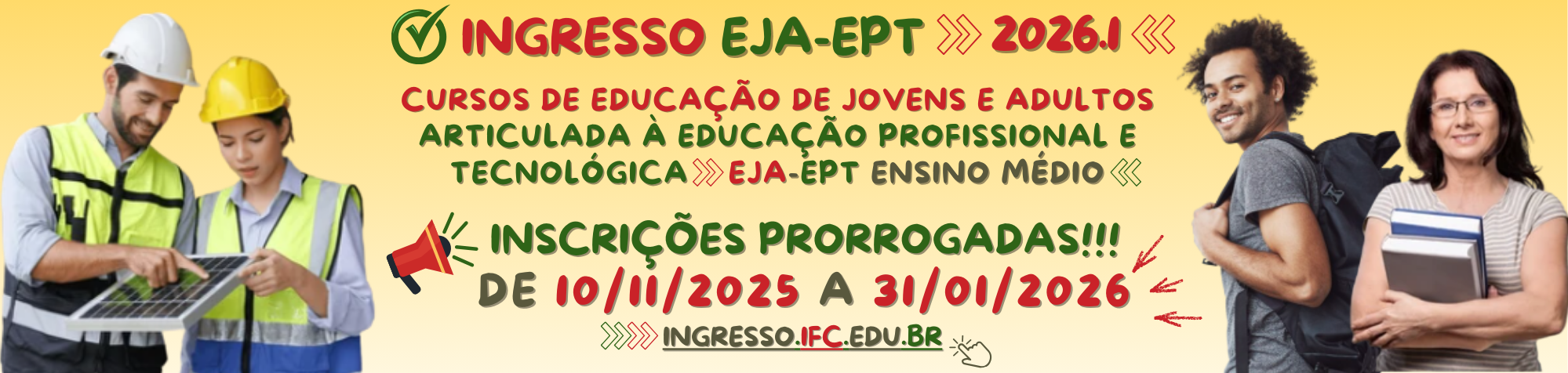 Confira a seguir o Edital do processo seletivo para os Cursos de Educação de Jovens e Adultos articulada à Educação Profissional e Tecnológica – Qualificação Profissional Ensino Médio (EJA-EPT), com ingresso no ano de 2026.