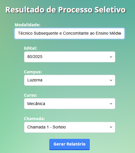 - Em seguida, selecione o Campus, o Curso desejado e a Chamada 1 – Sorteio