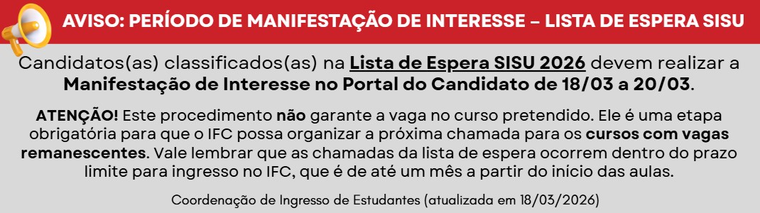 | 16/02/2026 | Disponibilização de vagas não preenchidas no Edital nº 13/2026, de demanda espontânea (se necessário) – caso restem vagas não preenchidas após a última chamada da Lista de Espera do Edital nº 02/2026 – SISU – considerando o limite de até 30 dias após o início das aulas. | No Portal de Ingresso do IFC (aqui) |
