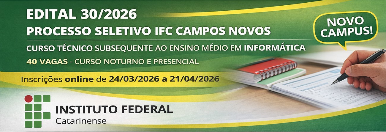 Confira o Edital nº 30/2026, que estabelece as datas e procedimentos para o processo seletivo de ingresso discente no Curso Técnico Subsequente ao Ensino Médio em Informática, ofertado pelo IFC Campos Novos, com ingresso no primeiro semestre letivo de 2026.