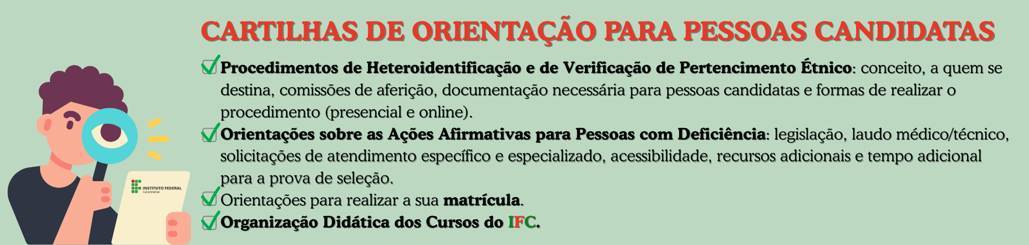 - Manual do Registro Acadêmico do IFC – para as pessoas candidatas aprovadas e convocadas para a matrícula.